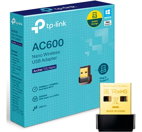 Adaptador USB 2.0 AC600 Inalámbrico (Archer T2U Nano) 433 Mbps frecuencia a 5GHz + 200 Mbs frecuencia 2.4GHz, compatible con el estándar 802.11 ac/a/b/g/n. Windows 10/8.1/8/7/XP (32/64bits), Mac OS X 10.9-10.13. El Archer T2U Nano recibe señales de Wi-Fi en dos bandas separadas. La compatibilidad con la tecnología 256QAM aumenta la velocidad de datos de 2,4 GHz de 150 Mbps a 200 Mbps para un rendimiento un 33% más rápido